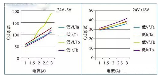 以兩個直流/直流轉換器為例,兩個都是24V輸入電壓,但其中一個是18V輸出電壓而另一個是5V。使用Vin和Vout的比值計算得到占空比,并且使用數據表中的Vf和Ir值計算出二極管內總功率的損失。然后根據總功耗計算出由此導致的二極管溫度,并查找在此溫度下的Vf和Ir實際數值。最后根據新的二極管溫度重新算出內部功耗。這個迭代過程可以重復多次以提高精確度,但如果只想大致表明Vf和Ir的不同取舍所產生的影響,單次迭代就足夠了。