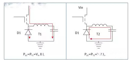 當時間為T2時,輸出電流(Iout)流經D1。所產生的損耗與D1的正向電壓(Vfw)和輸出電流直接相關。PT2等于Iout*Vfw。顯然,我們希望盡可能降低以控制損耗,減少發熱。